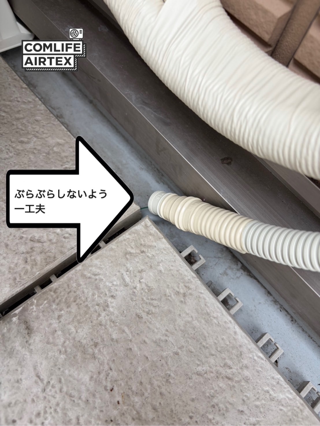 お水の排水ホースが風で揺れないよう、一工夫してます🙆